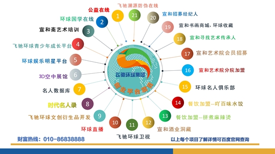 飞驰环球集团旗下拥有各类品牌项目涵盖文化艺术、餐饮行业、飞驰环球视频、环球直播、宣和艺术院、宣和斋培训、拜师学艺、环球文创、环球国学、国学百科、名人数据库、公益在线、3D展馆、环球收藏、成长平台、宣和洞藏酒、飞驰溯源、环球娱乐、环球名人俱乐部等为创业者量身打造的创业项目,让创业者实现自己的商机,实现您创业的梦想,开拓自己的事业,打造属于自己的平台。